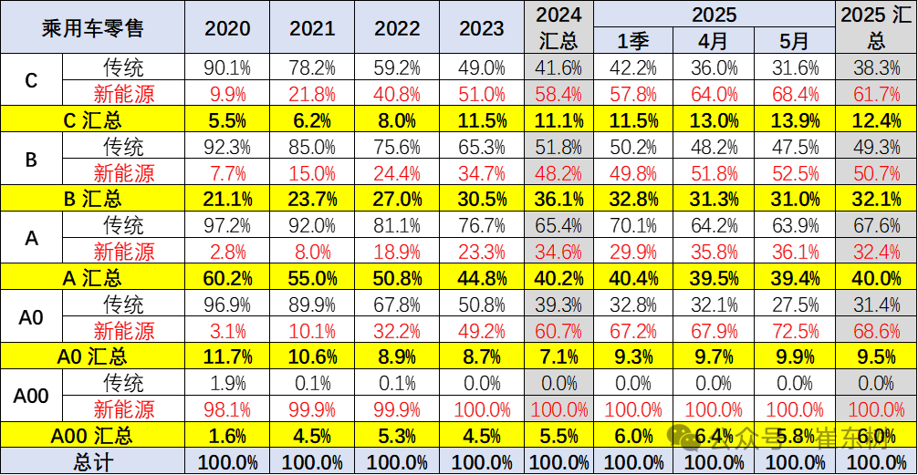 5万元以下车型2021-2022年较2020年的占比持续上升,主要是微型电动车的销量贡献。但2023年以来又持续下降,2025年的5万元以下车型的销量占4.3%,较2024年上升1.1个百分点。5-15万元的传统车型的销量下滑与新能源车的增长抵消后,增长的趋势仍存在。