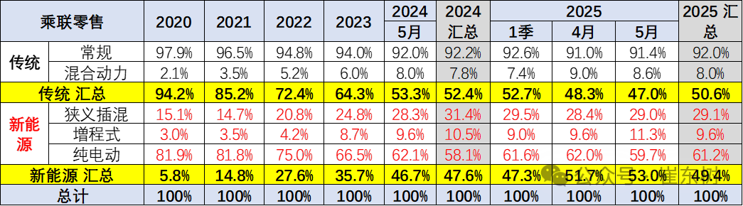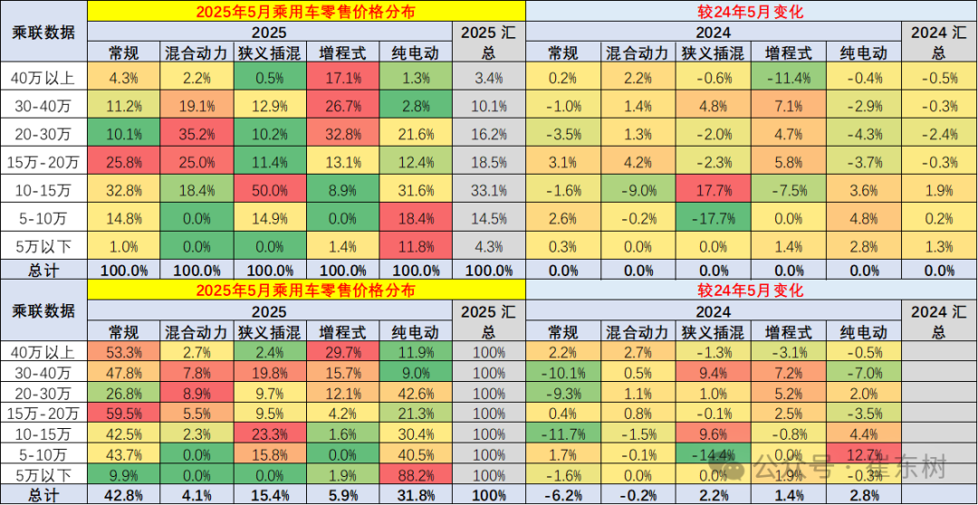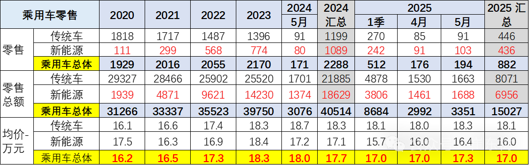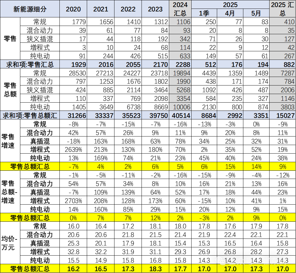 常规燃油车价格持续上升,市场萎缩在中低端很明显,而高端萎缩慢,因此从2019年的15万元上升到2024年的18.3万元。随着高端的萎缩较快,2025年1-5月的均价降低到18.1万元,5月保持在18.3万元,燃油车购买群体买车少了。