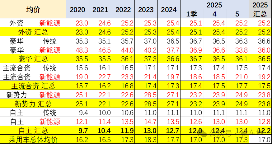 2025年1-5月豪华车均价36.5万元,较2024年持平;合资品牌17.5万元,较2024年增0.2万元;新势力23.8万元,较2024年降3.3万元;自主车企均价12.2万元,较2024年降0.5万元。