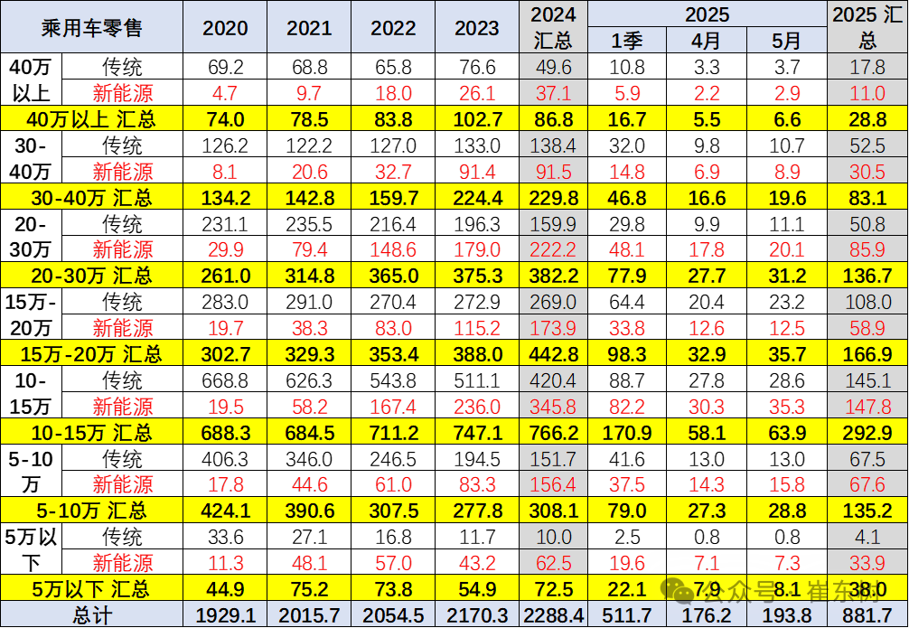 6月12日,乘联分会秘书长崔东树发表5月全国乘用车市场价格段分析。根据乘联数据,2025年5月全国乘用车市场零售192.3万辆,同比增长12.8%,环比增长9%。今年累计零售880.2万辆,同比增长9%。5月新能源乘用车市场零售102万辆,同比增长28%,环比增长12%;1-5月累计零售435万辆,增长34%。2024年乘用车市场均价是17.7万元,2025年1-5月乘用车均价是17万元,5月乘用车均价17.3万元,5月均价较同期下降0.7万元。